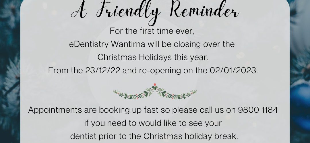 Just a friendly reminder that eDentistry Wantirna will be closing their doors during the Christmas Holiday period and will be back open for business on the 2nd of January 2023. If you would like to see the dentist prior to the silly season; please contact us with your enquiry ASAP as spots are quickly being filled.