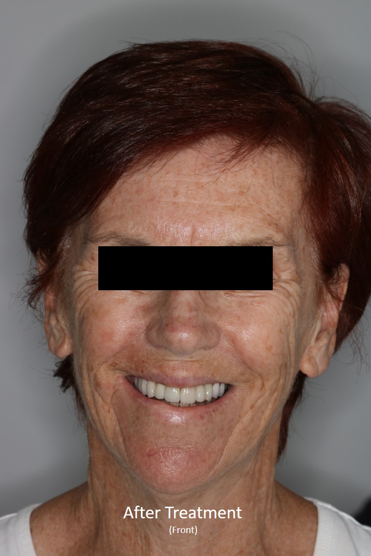 Look at DB’s teeth after veneers, crowns, bridges and a partial denture have been used to restore her smile.