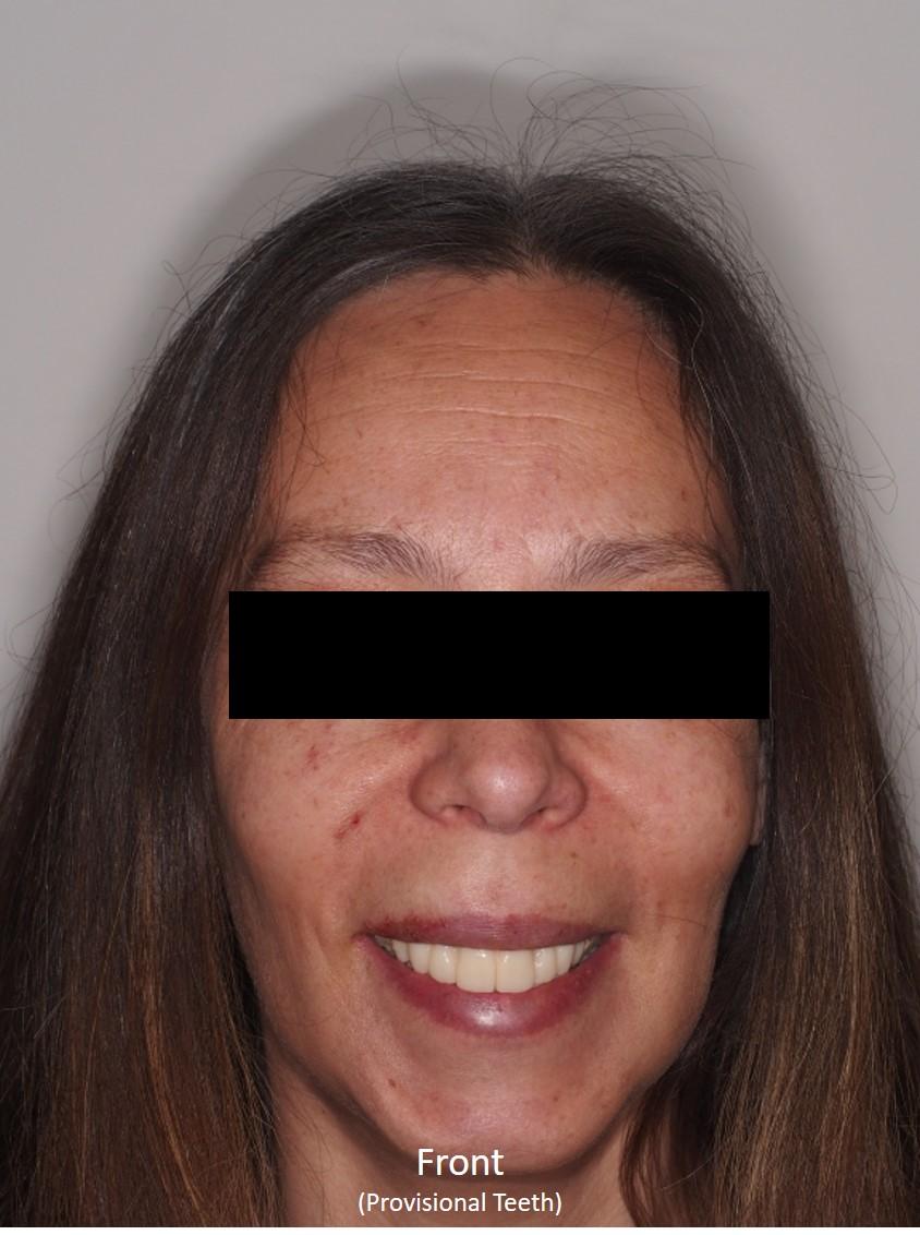 On the day of the procedure, all the remaining unsalvagable teeth were removed and 4 implants were placed on the upper jaw and 4 implants were placed in the lower jaw. The provisional fixed provisional prosthesis was inserted on the same day, and ET left the clinic with a beautiful new smile. See the photos to the right for reference.