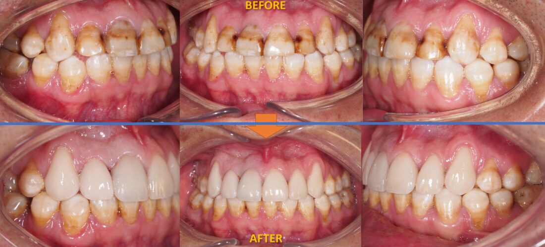 2of2 This is the same case, but inside the mouth. The patient only wanted to have his front six teeth veneered to remove the discolouration from malformed enamel as well as change the length of them to make the smile nicer.
