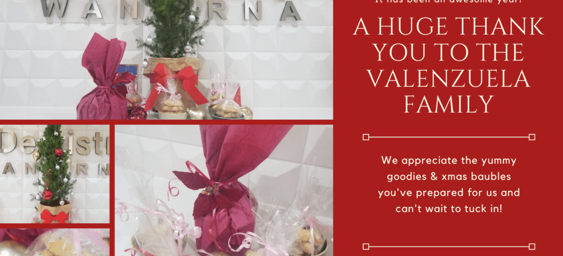 Thanks to the Valenzuela Family. We absolutely love the beautiful vibes you bring with you to the eDentistry Practice. Thanks for the yummy goodies and Xmas baubles – they’ve made a great addition to our tree!