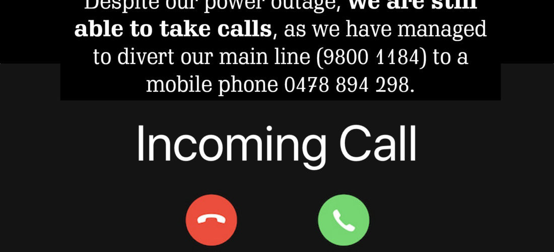 Despite our power outage, we are still able to take calls, as we have managed to divert our main line (9800 1184) to a mobile phone 0478 894 298.